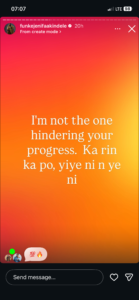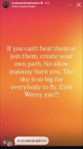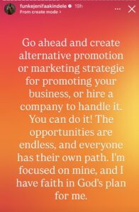 Funke who was diplomatic with her comment rejected the notion that anyone else’s success should be blamed for another person’s challenge. “I’m not the one hindering your progress,” she wrote, urging creatives to avoid jealousy and instead carve out their own paths.